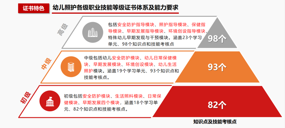 在证书标准方面,金职伟业组织院校及行业专家,依据国家职业标准,借鉴国内外先进案例,经过多次研讨论证,确定初、中、高级婴幼儿照护各级职业技能等级证书,并制定包括安全防护、生活照料、日常保健、早期发展等多模块考评标准。