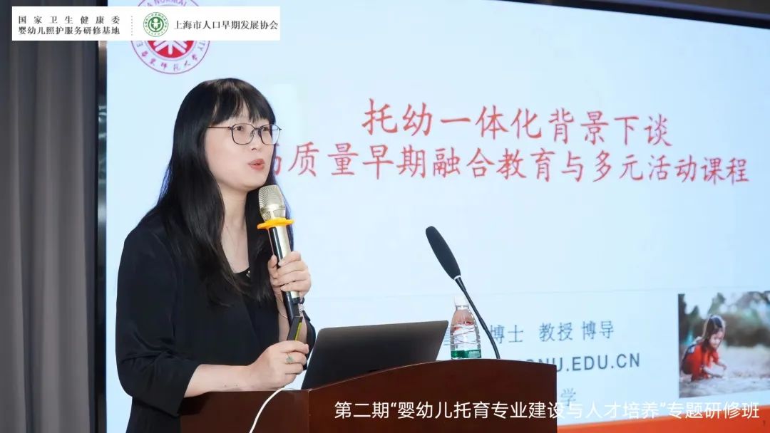 在开班仪式上,上海市人口早期发展协会副会长、婴幼儿照护服务专委会会长刘金华老师作为主办方代表作欢迎致辞,表达了对来自全国各地托育服务相关专业院校老师的欢迎,对本次活动的指导单位和协办单位支持的感谢,并向学员们介绍了协会的相关业务内容,以及即将上线的《婴幼儿托育线上学习课程》。本期研修班得到了上海济光职业技术学院的大力支持,学前教育学院院长方慧老师、副院长傅晨老师出席开班仪式,学院骨干教师、学生代表参与研修交流。图:苏雪云老师作主旨报告 图:童连老师作主旨报告
